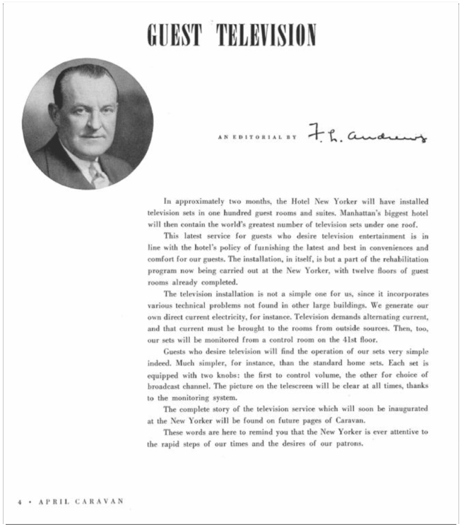 The New Yorker becomes one of the first hotels in the world to install television. With 100 sets, it advertises itself as having the most television sets under one roof at the time, reminding guests that the hotel is “always attentive to the rapid steps of our times”.