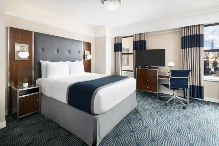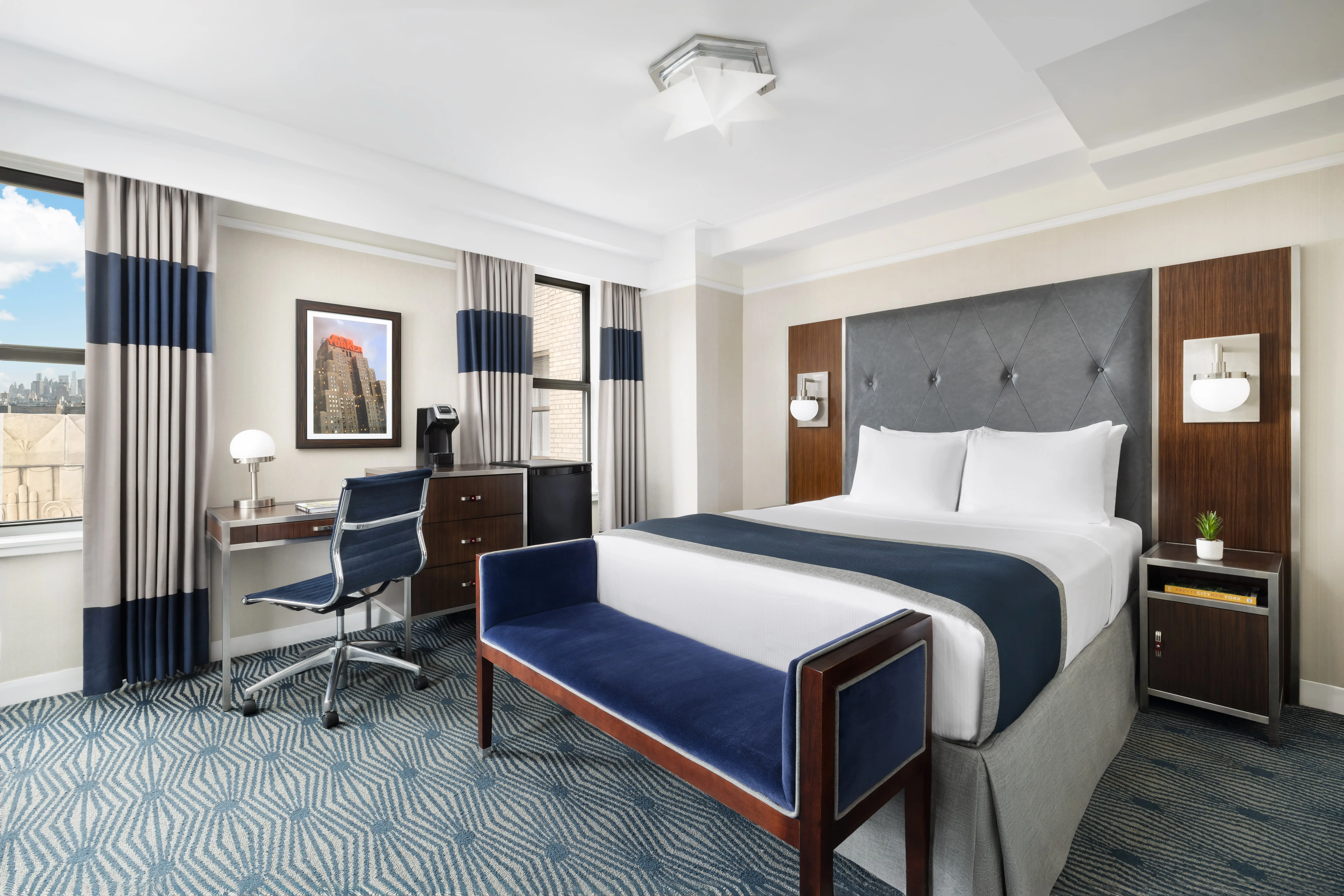 Take the New Yorker’s Art Deco Executive Queen Rooms and add irresistible views of the Manhattan skyline. Our Executive View guests enjoy classic Art Deco details as they unwind amid modern comforts, and feel the pulse of Midtown below in timeless, elegant New York accommodation.